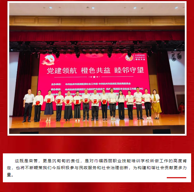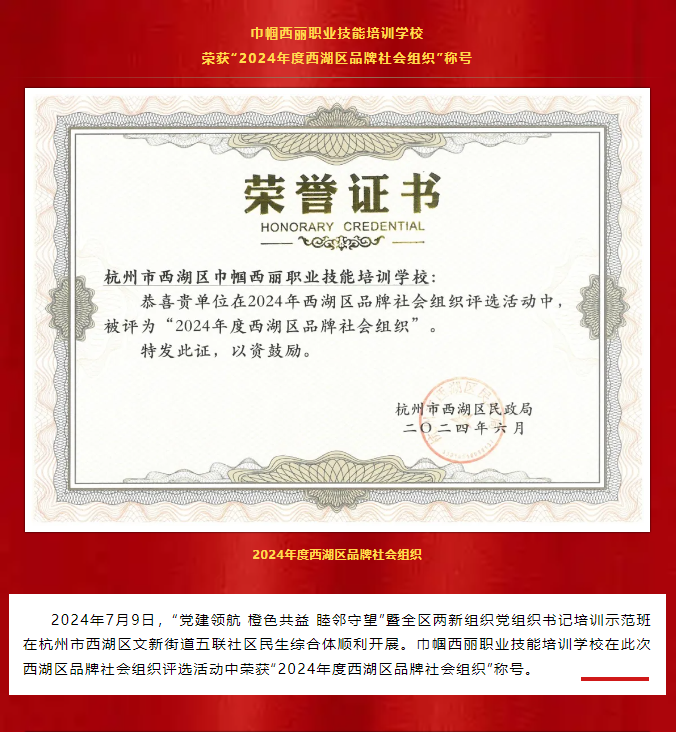 巾幗西麗職業技能培訓學校榮獲“2024年度西湖區品牌社會組織”稱號