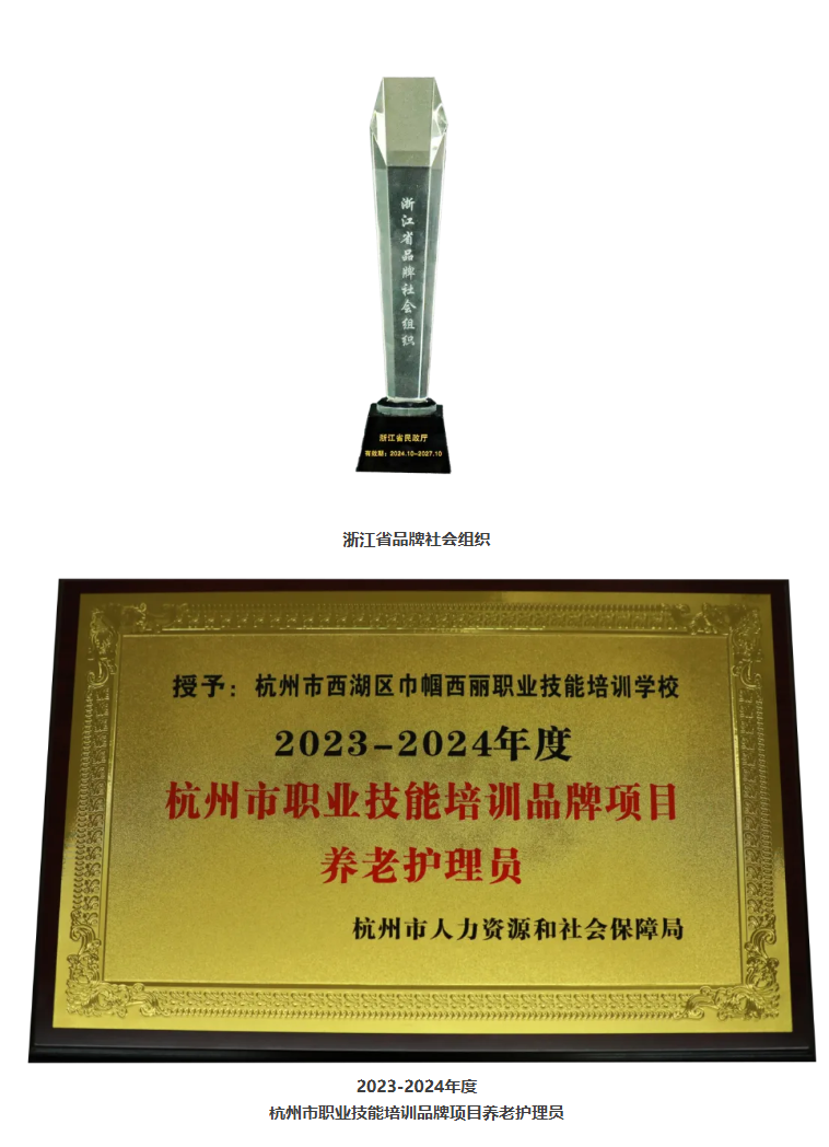 近日,巾幗西麗職業技能培訓學校先后榮獲浙江省民政廳頒發的 “浙江省品牌社會組織” 稱號及杭州市人力資源和社會保障局頒發的 “2023 - 2024 年度杭州市職業技能培訓品牌項目養老護理員” 稱號。
